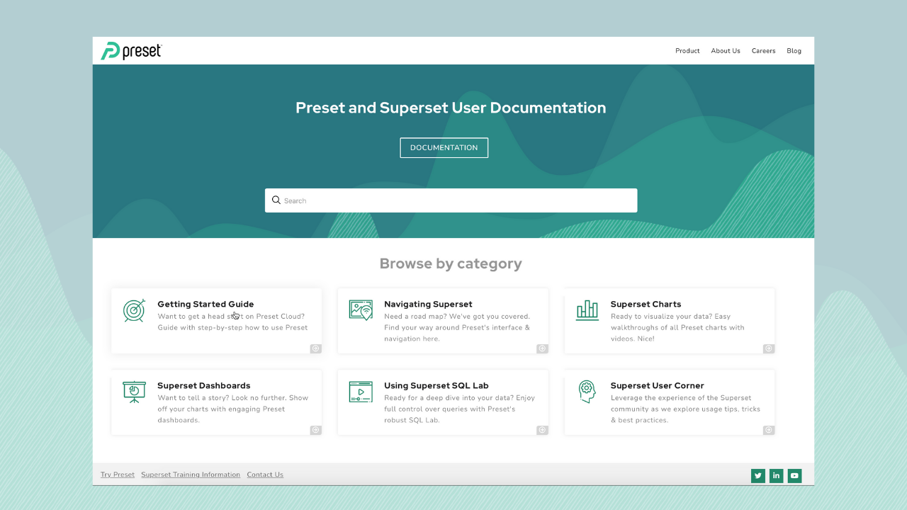 This end-user documentation is focused on taking you step-by-step through the entire onboarding Preset Cloud experience, from connecting your data to building your very first chart and dashboard.