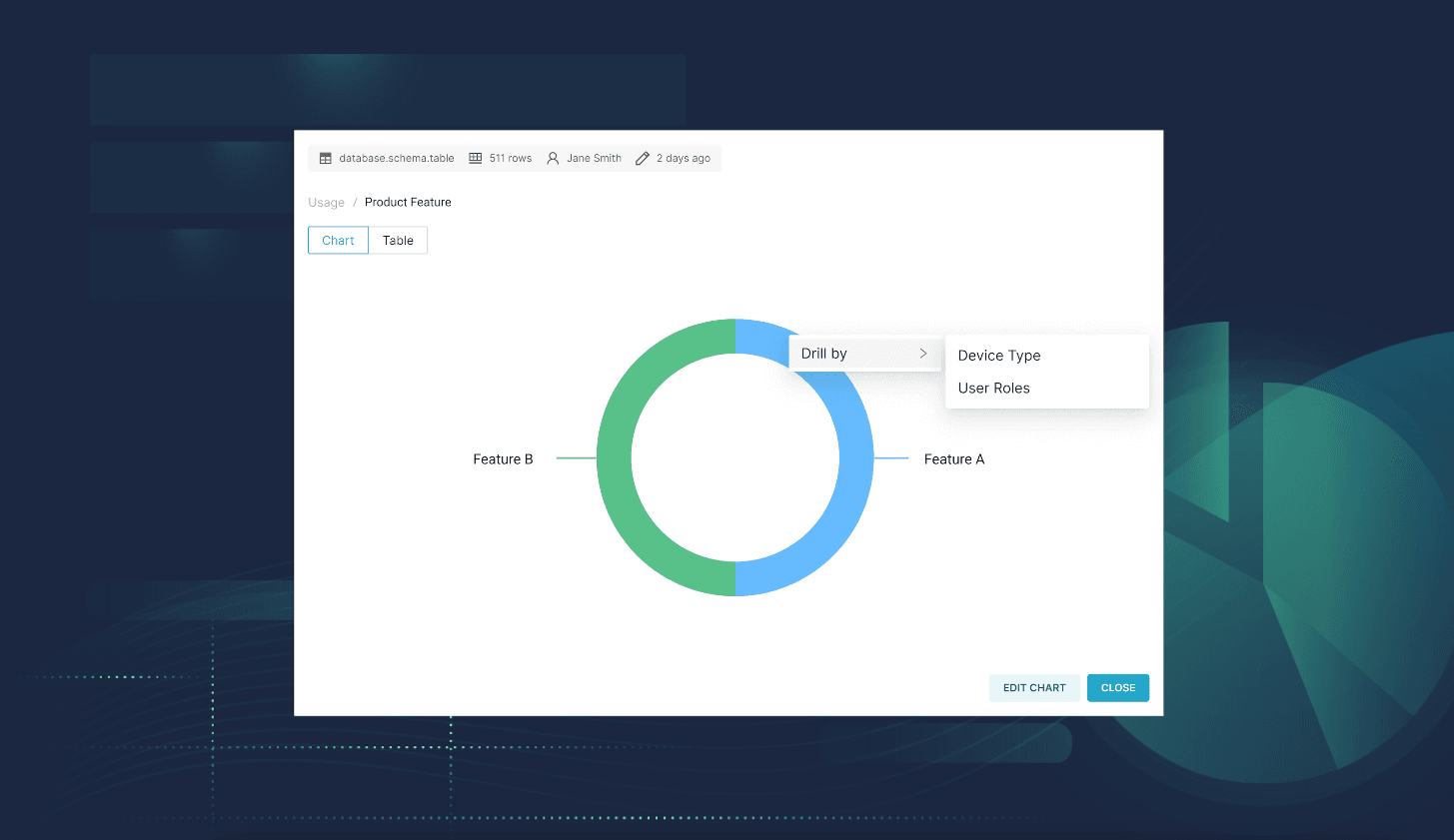 You can create and save the drilled results as a new chart, allowing you to add it to your dashboard or access it later. To do so, click on the “Edit chart” action in the Drill By modal in the Dashboard view (i.e., you don’t need to go to the Chart Builder!).